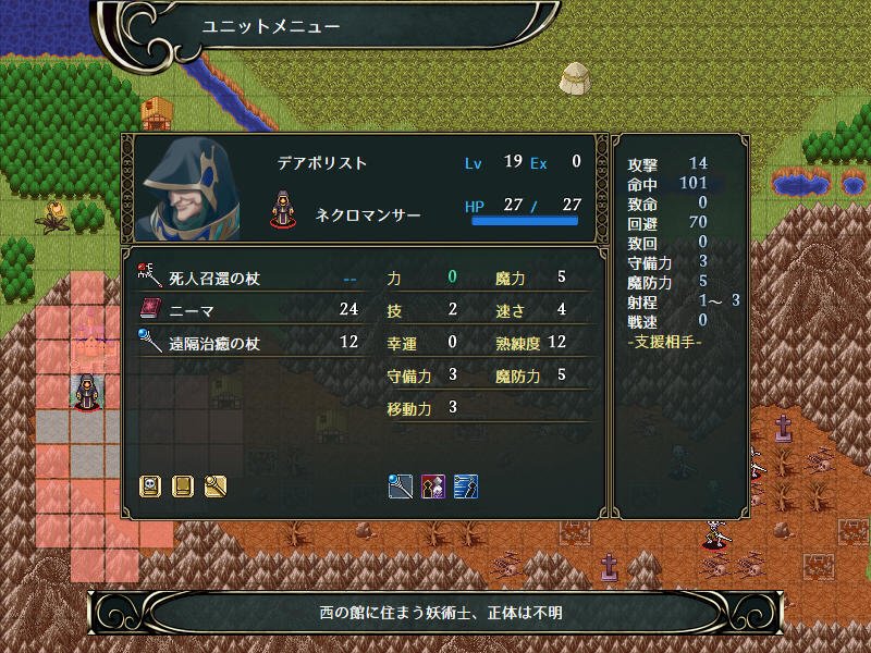 とりあえずの目標はデアボリスト(死霊術士)がいる西の館の制圧。マップを見た感じ、後半がアリそうですね。序盤は墓場から、わらわら敵増援が湧いてくるのかな。
